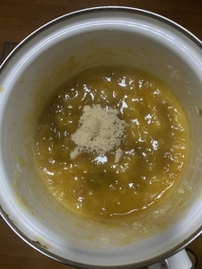 5.残りの砂糖を入れ煮詰めていきます。アクが出てきたら、取りのぞいてください。