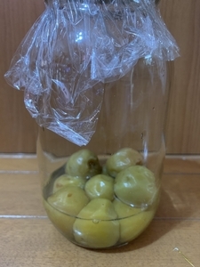 - 青梅は重石をのせます。青梅も黄色い完熟梅もなるべく涼しいところで保存してください。