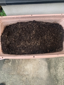 苗を植え付けて2週間度、プランターの縁に培養土と化成肥料を混ぜた土を入れ、軽くならしました。