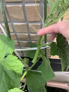 - 15節目以降のわき芽(子づる)を、葉を2枚、節を1節を残して摘芯(先端を摘み取る)し、過度な成長を抑制します。親ヅルと子づるに栄養が分散されるため、小さいきゅうりになることもあります。